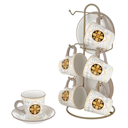 Set 6 Tazzine da caffè con Piattino in Ceramica e Stand in Metallo 14X13X28 cm